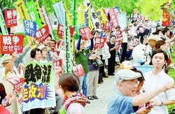 ![]() (写真)戦争法案の廃案を求めて国会前で抗議する人たち=16日、東京都千代田区 |