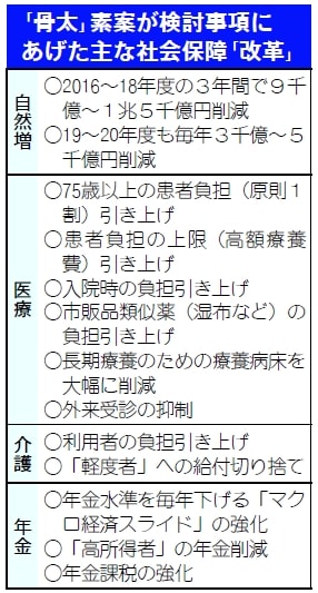 もう一つは社会保障費の削減です。同日に政府が開いた経済財政諮問会議(議長・安倍晋三首相)で、「改革項目」を列挙して次のように迫りました。