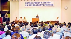 ![]() (写真)「言論弾圧を許さない」と開かれた沖縄県民集会=4日、那覇市 |