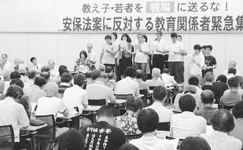 戦争と専制政治への不安の影に「教え子・若者を再び戦場に送るな」と20日、長野市で「安保法案に反対する教育関係者緊急集会」が開かれました。県教育長・高校長経験者から、教職員組合運動関係者まで、立場を超えて約350人が参加する歴史的な集まりに発展し、デモ行進で法案ストップを訴えました。