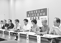 小沢隆一東京慈恵大学教授、永山茂樹東海大教授など憲法研究者有志は28日、参院議員会館内で記者会見し、「安保関連法案の強行採決に抗議するとともに、そのすみやかな廃案を求める」と題した声明を発表しました。賛同者は1週間で204人を超えています。