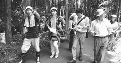 ![]() (写真)リニアルート予定地で地元住民の案内を受ける(前列左2人目から)本村、たけだ、島津の3氏 ら=1日、岐阜県可児市 |