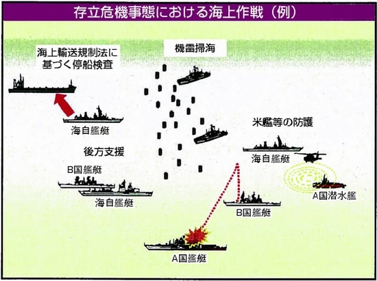 仁比氏が示したのは、海上幕僚監部防衛課と海自幹部学校作戦法規研究室が作成した「平和安全法制案について」とする内部資料。(1)停船検査(2)後方支援(3)機雷掃海(4)米艦等の防護―の四つの活動を「存立危機事態における海上作戦」として説明。「機雷掃海」と「米艦防護」は自衛隊法88条に基づく武力行使であり、残る二つも、いわゆる「戦闘現場」で実施することが可能であるとの見方を示しました。