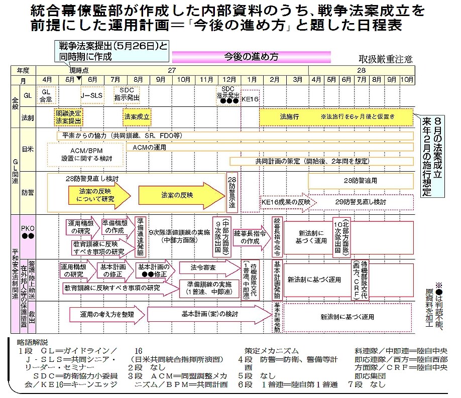 従来のPKOでは、自衛隊の武器使用は「自己保存」=“襲撃を受けたとき、自分の身を守るための正当防衛”に限っていました。戦争法案では、他国部隊の戦闘に参加する「駆け付け警護」を可能にしています。これは当然、「自己保存」を超えるので、「任務遂行型」の武器使用になります。中谷元・防衛相は11日の参院安保法制特別委員会で、これらの活動について、「法案が成立すれば可能になる」と明言しました。上記の資料にある日程表によれば、来年3月から戦争法案に基づくPKO部隊の運用が行われることを、すでに想定しています。