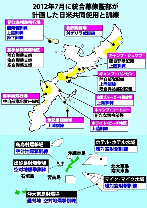 日本共産党の山下芳生書記局長は、14日の参院安保法制特別委員会で、自衛隊統合幕僚監部が作成した内部資料「日米の『動的防衛協力』について」を示して、在沖縄米軍基地13施設・2水域(地図参照)で日米共同使用が迫られ、自衛隊の司令部を米海兵隊司令部と同じ場所に配備する計画を暴露しました。中谷元・防衛相は「あらゆる選択肢を排除することなく、幅広く検討している」と答弁し、自衛隊と米軍の一体化の実態について否定しませんでした。(詳報)