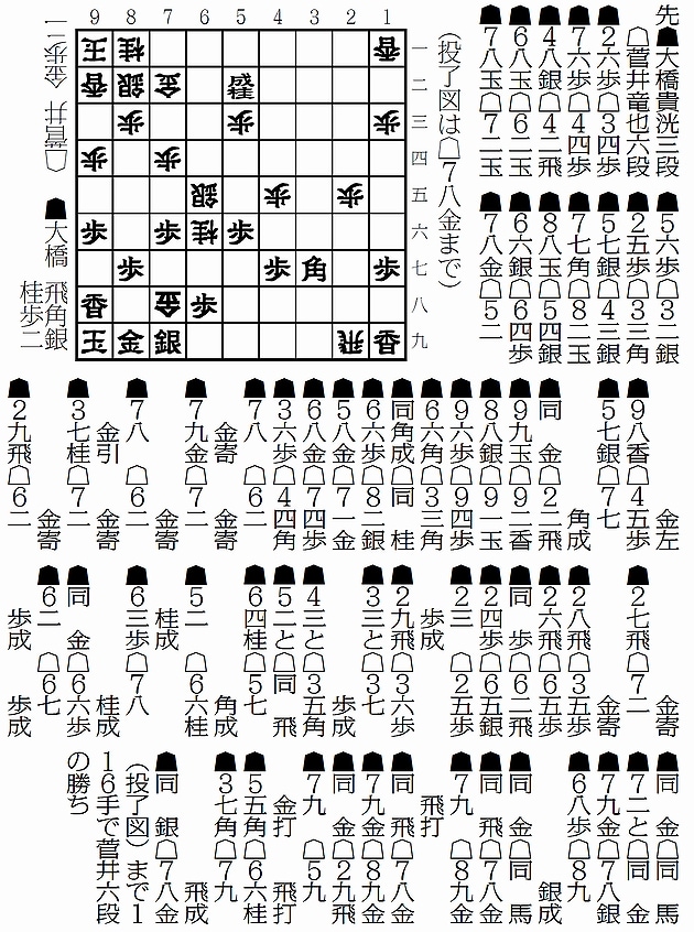 大橋三段の先勝で迎えた本局も第1局同様午前中は非常に速い進行。先手大橋三段の居飛車に後手菅井六段の四間飛車で、相穴熊となりました。