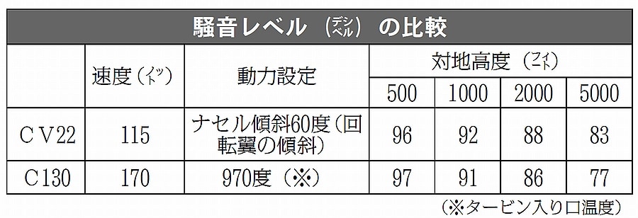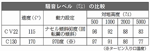 横田にはCV22を10機配備。これは他の航空機との交代ではなく純増になるため、騒音も増加します。レビューによれば、エンジンナセル角度60度の場合、横田に配備されているC130輸送機とほぼ同じになる見通しです(表)。建物のがたつきや、心理的不快感を発生させる低周波騒音の発生にも言及しています。 (竹下岳)