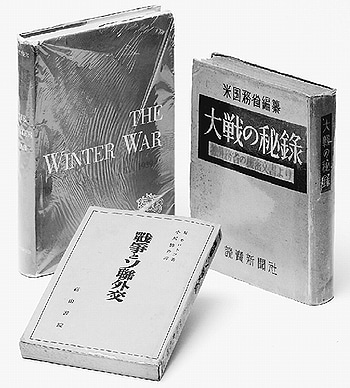 ![]() (写真)『スターリン秘史』研究で役立てた本の一部。『冬戦争』(後ろ左)、『大戦の秘録』(後ろ右)、『戦争とソ連外交』(手前) |