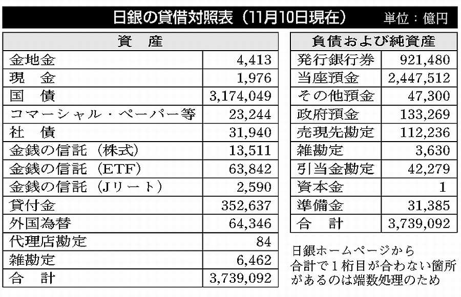 貸借対照表はある時点の企業の財務状況がどうなっているかをあらわした表です。左側に「資産」、右側に「負債および純資産」を記載し、資産を買った費用がどこから出たかを示します。左右の合計額は一致します。日本銀行も10日ごとに貸借対照表を作成、発表しています。11月10日時点では表のようになっています。