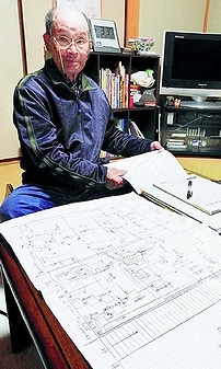 ![]() (写真)毒ガスの製造工程図を前に話す藤本安馬さん |