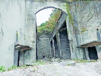 ![]() (写真)いまも残る巨大な毒ガス貯蔵タンクの跡。高さが11メートル、6基あり1基100トンの毒ガス液を貯蔵しました。「この地面の下はまだ毒で汚染されています」(毒ガス島歴史研究所の山内正之さん)=7日、広島県竹原市の大久野島 |