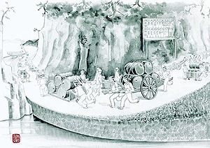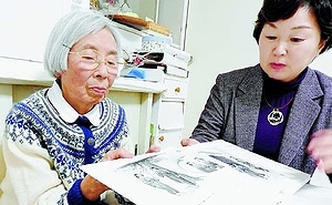 ![]() (写真)(上)1日13往復、毒ガス液が入ったドラム缶を桟橋まで運びました(岡田黎子さんの著作『大久野島・動員学徒の語り』から)(下)大久野島での学徒動員を描いた絵について語る岡田さん(左)。右は寺田元子共産党三原市議 |