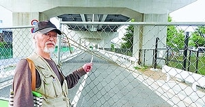 ![]() (写真)工事中に毒ガス入りのビール瓶が出土した高速道路の橋脚下を指す北宏一朗さん=神奈川県寒川町 |