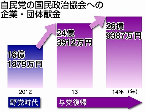 自民党の政治資金の受け皿団体である「国民政治協会」(国政協)が14年に集めた企業や業界団体、業界でつくる政治団体からの献金総額は26億9387万円。12年末の総選挙で同党が政権復帰し、安倍政権が本格始動した13年の献金総額24億3912万円を上回りました。