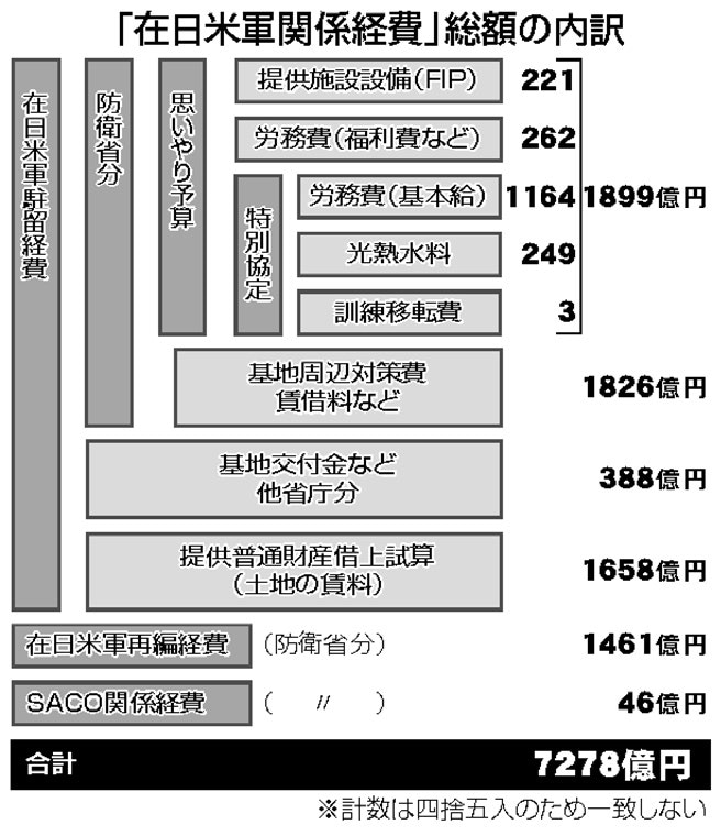 現在の在日米軍関係経費の内訳は、(1)在日米軍駐留経費(思いやり予算、基地周辺対策費、基地交付金、土地の賃料等)(2)在日米軍再編経費(辺野古新基地等)(3)SACO(沖縄に関する特別行動委員会)関係経費―から構成されています(図)。この大部分は、日米安全保障条約上、日本の支払い義務がありません。