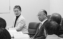 ![]() (写真)住民との話し合いによる解決を求める上田議員(正面向き左端)と庄本議員(その右)=11日、西宮市議会 |