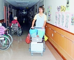 ![]() (写真)台車を押し、おむつ交換に回る夜勤職員=兵庫県西宮市の特養ホーム・甲寿園 |