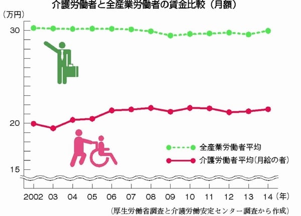 実際、介護事業所の60%が職員不足と回答しています。不足理由の72%は「採用が困難」。その原因の61%が「賃金が低い」です(14年度「介護労働実態調査」)。介護職員の給与は、全労働者平均より月10万円も低いからです。