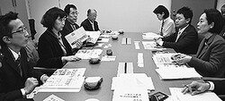 ![]() (写真)日本私大教連の野中委員長(左から2人目)と懇談する(右から)畑野氏、大平氏=15日、国会内 |