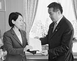 ![]() (写真)馳浩文科相(右)に申し入れ書を渡す畑野君枝衆院議員=18日、文科省 |