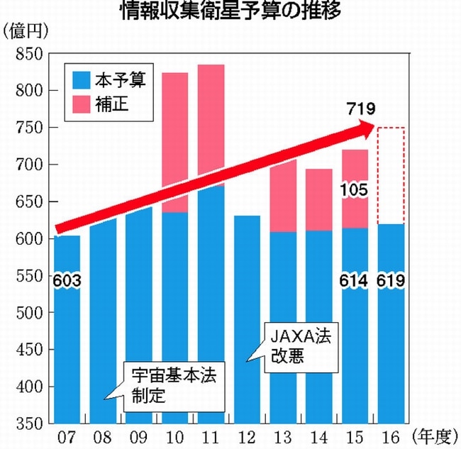 宇宙の軍事利用が広がっています。安倍晋三政権の2016年度予算案は、情報収集衛星(軍事スパイ衛星)に15年度当初比5億円増の619億円を計上しました。第2次安倍政権発足後4年連続の増額になります。15年度補正予算案では105億円を計上しています。15年度の本予算614億円との合計では719億円に達します。安倍政権は毎年度、補正で情報収集衛星予算を増額しており、16年度も補正で増額される可能性があります。