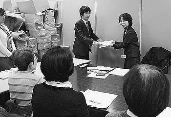 ![]() (写真)内閣府の担当者に要請書を渡す柴田会長=5日、内閣府 |