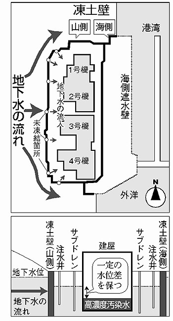 地下水が遮断され汚染水の発生量を大幅に抑制できると期待される一方、地下水位が下がりすぎると建屋内の汚染水が周辺に流出する恐れがあるからです。建屋周辺のサブドレン(井戸)から地下水をくみ上げる作業を進めながら、建屋内の水位よりも地下水位を高くすることが必要です。