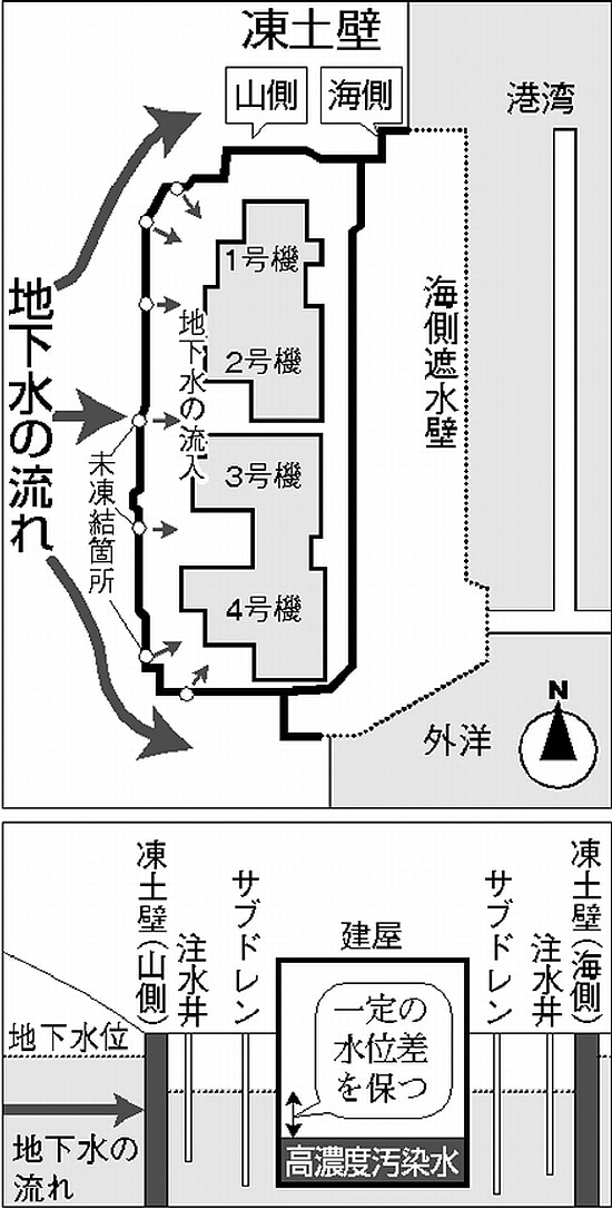 地下水が遮断され汚染水の発生量を大幅に抑制できると期待される一方、地下水位が下がりすぎると建屋内の汚染水が周辺に流出する恐れがあるからです。建屋周辺のサブドレン(井戸)から地下水をくみ上げる作業を進めながら、建屋内の水位よりも地下水位を高くすることが必要です。