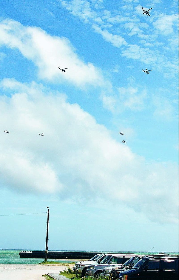 ![]() (写真)とどろく爆音 辺野古漁港の上空を爆音をとどろかせて飛行する7機の米軍ヘリ。先行の1機と後続3機を合わせて11機が通過=10日午後1時半すぎ、沖縄県名護市 |