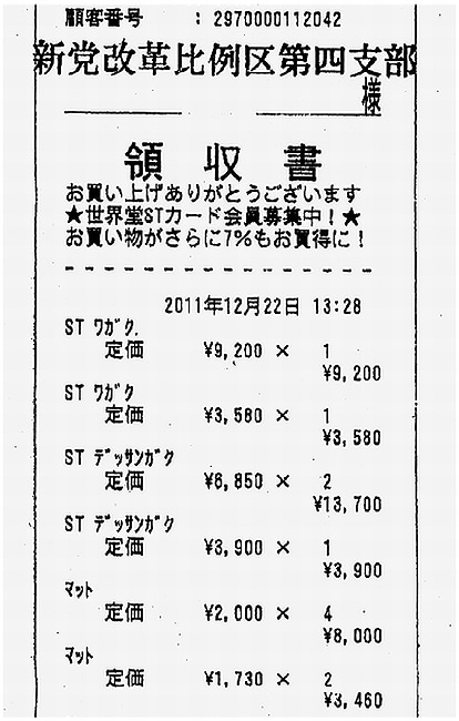 本紙は「新党改革比例区第四支部」と資金管理団体「グローバルネットワーク研究会」(どちらも2014年に解散)が政治資金収支報告書に添付した領収書を情報公開請求で入手。