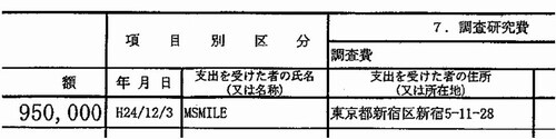 この政党支部は、「自民党東京都第10選挙区支部」。2012年〜14年の政治資金収支報告書によると、「調査研究費」の「調査費」の名目で、12年12月に95万円、13年1月に25万円、14年11月に90万円、計210万円が、「M―SMILE」というところに支払われています。