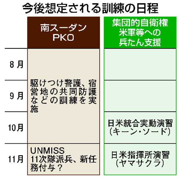 南スーダンPKOへの11次隊は、陸自東北方面隊の傘下にある第9師団を中心に編成される方針。同師団第5普通科連隊(青森駐屯地)の約40人は5月にモンゴルであった多国間共同訓練カーン・クエストの場で、新任務に近い訓練を実施・視察しており、同隊や、海外派兵を専門とする中央即応集団の各部隊が主力になるとみられます。