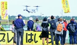 ![]() (写真)飛来したオスプレイに抗議する人たち=24日、千葉県木更津市 |