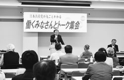 日本共産党を丸ごと知ってもらい、力を合わせて政治を変えようと「働くみなさんとトーク集会」が30日、名古屋市内に市田忠義副委員長・参院議員を招き行われました。主催は党愛知県委員会。118人の参加者には党綱領が書かれたパンフ『JCPマニフェスト』が配られました。