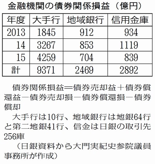 異次元緩和を行っている2013年度から15年度まで都市銀行10行の、国債売却益を中心とした債券関係損益で合計1兆円近くの利益が出たことを、大門氏は明らかにしました。黒田東彦日銀総裁は「(銀行の利益を)一定程度下支えしたことは事実だ」と認めました。