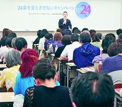 ![]() (写真)24条改定に反対するとりくみが広がっています(写真は2016年9月に東京都内で開かれた「24条変えさせないキャンペーン」のキックオフ集会(原田浩一朗撮影) |