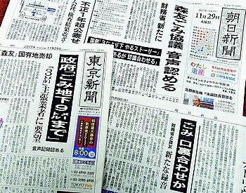 ![]() (写真)日本共産党の宮本岳志議員が衆院予算委で追及した国有地売却をめぐる「口裏合わせ」について1面で報じる各紙 |