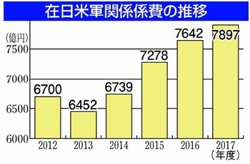 2017年度に日本政府が計上した在日米軍関係経費の総額が7897億円に達したことが判明しました。昨年度を255億円上回り、3年連続で過去最高を更新しました(グラフ)。外務省が日本共産党の赤嶺政賢衆院議員に提出した資料をもとに本紙が計算した結果、明らかになったものです。