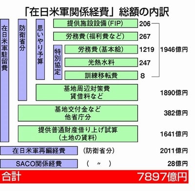 在日米軍関係経費 (1)在日米軍駐留経費(思いやり予算、基地周辺対策費、基地交付金、土地の賃料等)(2)在日米軍再編経費(3)SACO(沖縄に関する特別行動委員会)関係経費―という構成です(下図)。大半は日米安保条約上、支払い義務がありません。