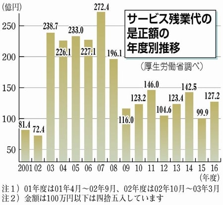 厚労省が調査を始めた01年以降の16年間の是正総額は2530億1924万円です。是正された労働者総数は216万5329人、企業総数は2万760社に達します。