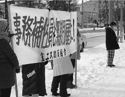 ![]() (写真)宣伝する職員組合員たち=19日、北海道室蘭市 |