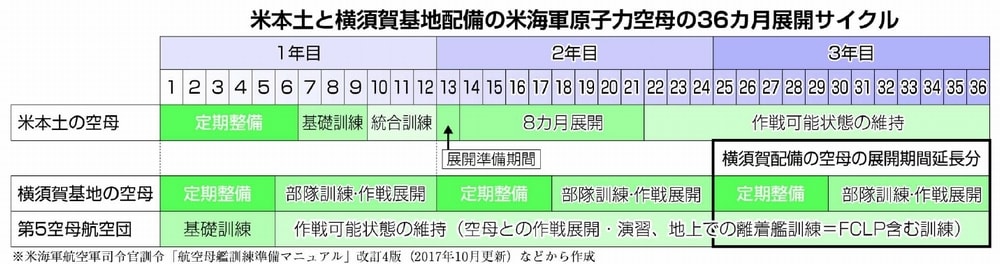 米本土を母港とする原子力空母について、「最適化艦隊対応計画」(O―FRP)に基づき、それまでの32カ月だった展開サイクルを36カ月に延長し、定期整備や訓練を除く作戦へ展開し、作戦可能な状態を維持する期間をこれまでの19カ月から23カ月に拡大。米本土を母港とする9隻の原子力空母のうち、14年にアイゼンハワーが36カ月サイクルを開始し順次、他の空母も移行しています。横須賀配備の原子力空母の36カ月への延長も、米本土の空母の展開サイクルと、より密接な連携をはかるためとしています。