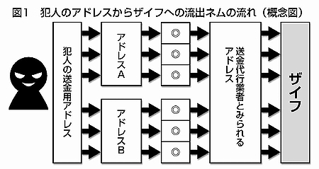 第二にこの送金は、いずれも図1のように、「犯人」側の送金用のアドレスから、間に三つのアドレスをはさむという、同じ形の経路で行われています。