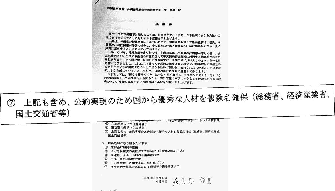 ![]() (写真)新基地建設にあいまいな態度をとりながら、安倍政権とは“合意済み”とばかりに職員派遣などを求めた「要請書」(拡大図) |