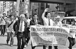 ![]() (写真)横断幕を先頭に繁華街を行進する(前列左2人目から右に)真島、楳本の両氏ら=1日、熊本市 |