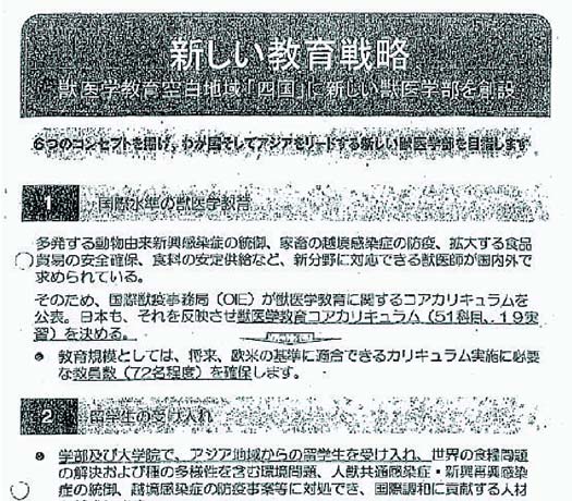 県文書は2015年3月15日に今治市と学園の協議内容を記録したもの。県文書によると、安倍首相と加計氏の面会時(同年2月25日)に学園が資料『新しい教育戦略』などを提供。ここから「目指すべき大学の姿に関する部分を抜粋したアンケート形式の資料」をつくり、短期間で専門家に意見を求めたとしています。