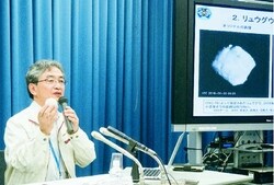 ![]() (写真)はやぶさ2の到着が近づき、小惑星「リュウグウ」の模型を手に説明する吉川真JAXA准教授=21日午後、東京都千代田区のJAXA東京事務所 |