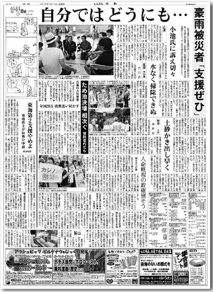 6日夜、土砂災害や河川の氾濫など各地で甚大な被害がさらに広がりました。被災者救援や安否確認、実態把握などにあたる日本共産党の国会議員や各地の地方議員、党組織などに取材。「赤旗」読者からも被害状況の写真・映像が寄せられました。11日付15面では「水、人手、情報がほしい 支援の本格化必要 岡山・真備」との大見出しで報じました。