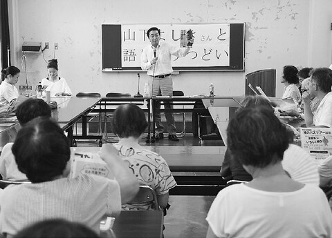 山下氏は冒頭、来月実施される沖縄県知事選に、「オール沖縄」の候補として玉城デニー氏が立候補表明したことにふれ、辺野古新基地建設阻止へ勝利に全力をあげると決意表明。山下氏の「きょうはいろんな声を聞かせてください」との呼びかけに参加者から質問や意見が次々と出されました。