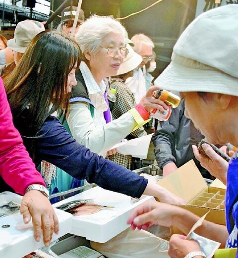 参加者は、軽食・飲料販売の丸八船舶食糧商店で飲み物などを買い、水産仲卸の明藤商店でウニの瓶詰などを購入しました。
